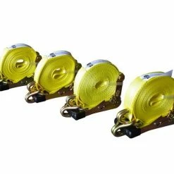 Transport your cargo safely with these J hook ratchet tie downs with rubber padded grips. These four 27-foot tie downs feature 10,000 pounds of break strength to help secure your cargo in transit.