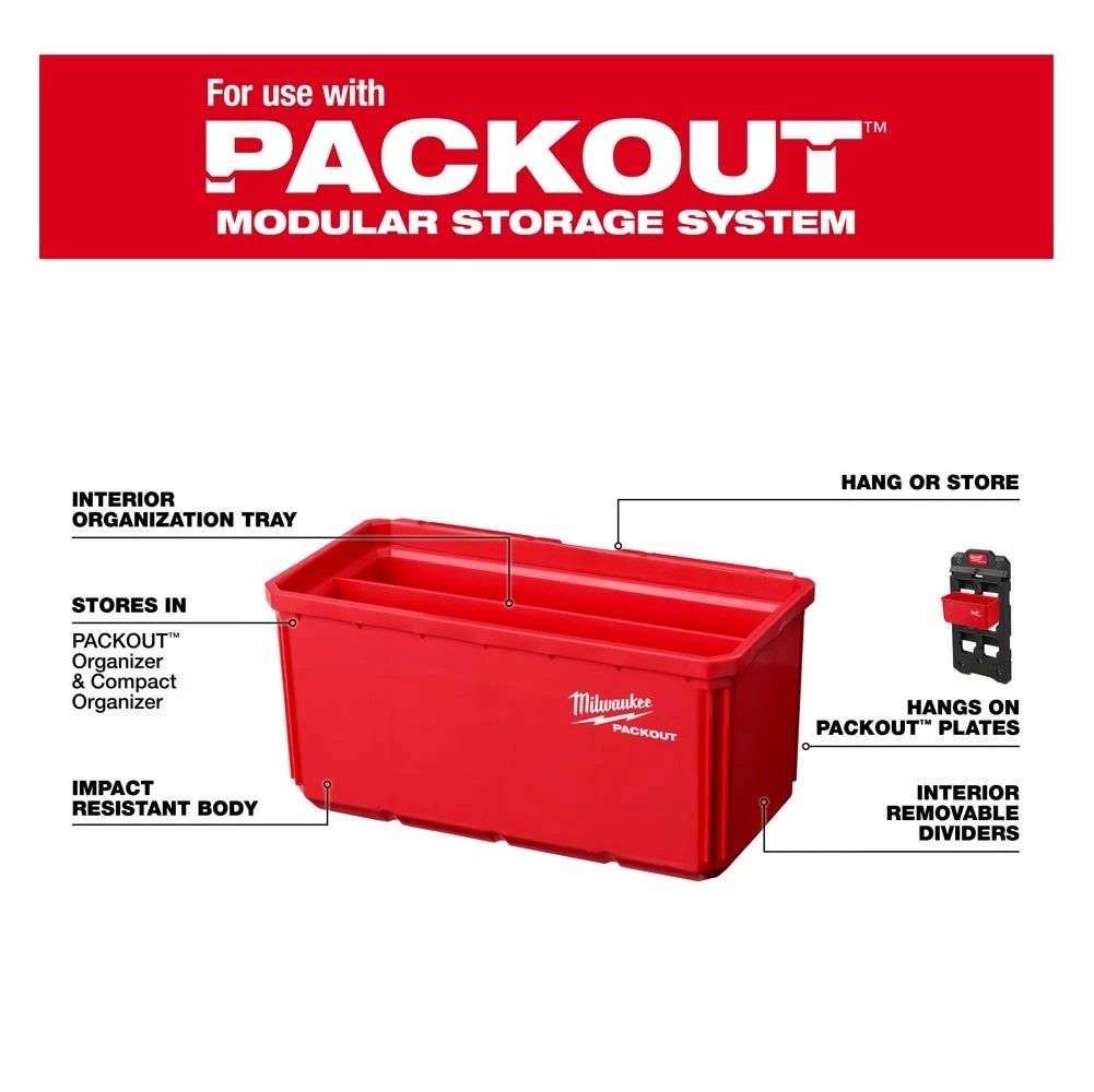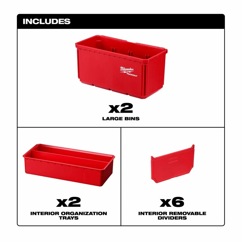 Our 2pk Large Bin Set for PACKOUT™ can be stored inside MILWAUKEE® PACKOUT™ Organizers and Compact Organizers (48-22-8430 & 48-22-8435) and hung on Mounting Plates. Constructed with an impact resistant body, these bins are built to withstand harsh jobsite conditions. Each large bin features a removable interior organization tray to organize jobsite supplies. These large storage bins can be used to organize and store small items like fittings, fasteners, bits, and more. Our Large Bin Set includes (2) Bins, (2) Interior Organization Trays, and (6) Removable Dividers. MILWAUKEE® PACKOUT™ is the industry’s most versatile and durable modular storage system.