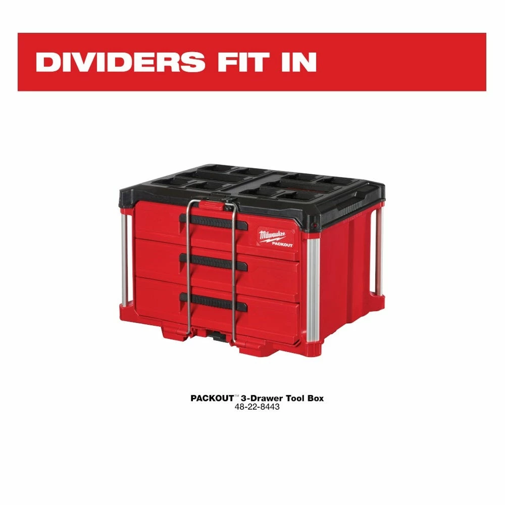 Our Drawer Dividers for the PACKOUT™ 3-Drawer Tool Box allows you to customize your storage. The adjustable drawer dividers are designed for you to create custom layouts to fit your tools, accessories, and equipment. The Drawer Dividers work with the MILWAUKEE® PACKOUT™ 3-Drawer Tool Box (48-22-8443). The Quick-Adjust Dividers help keep your tools and equipment organized the way you want.