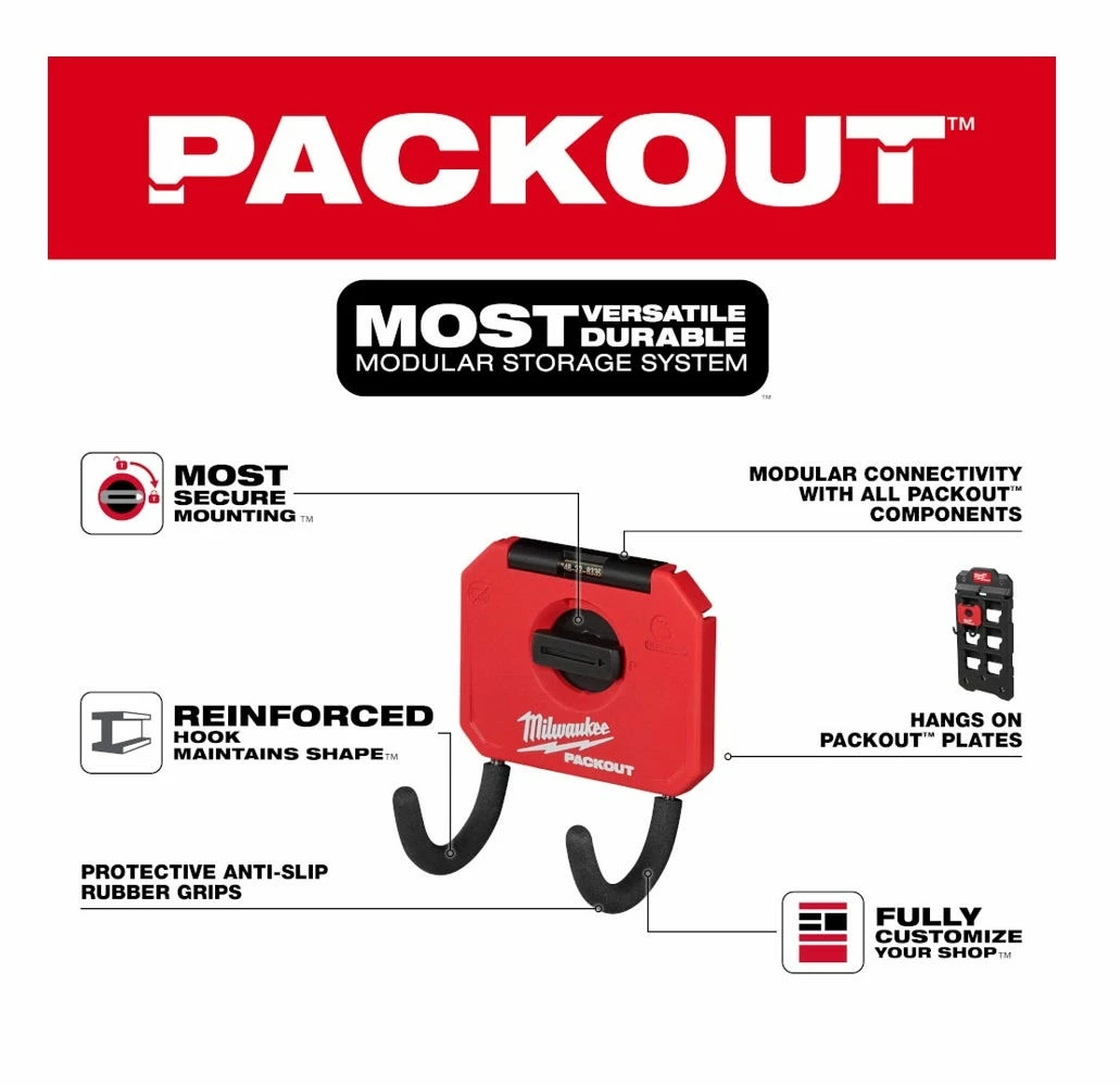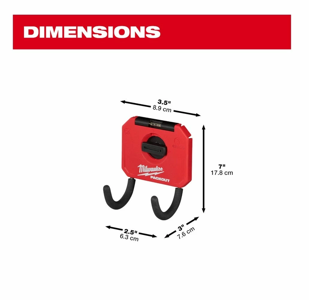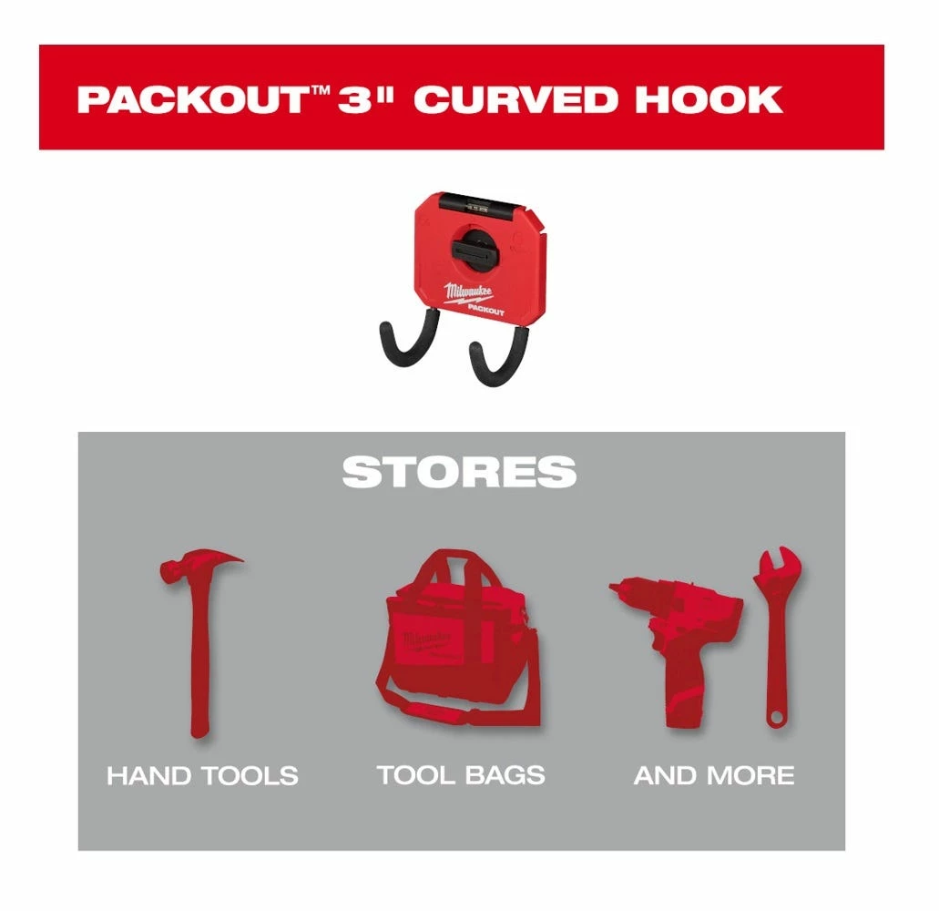 Our PACKOUT™ 3″ Curved Hook delivers the most secure mounting when paired with PACKOUT™ Wall Plates, strongly holding the PACKOUT™ solution mounted to the wall. This hook is constructed with metal reinforcement to maintain shape when loaded and is optimized to store hand tools, tool bags, and more. To keep your tools securely in place and protected, our hook features protective rubber grips. Additionally, the hook features connectivity with PACKOUT™ solutions allowing you to fully customize your shop, MILWAUKEE® PACKOUT™ is the industry’s most versatile and durable modular storage system.