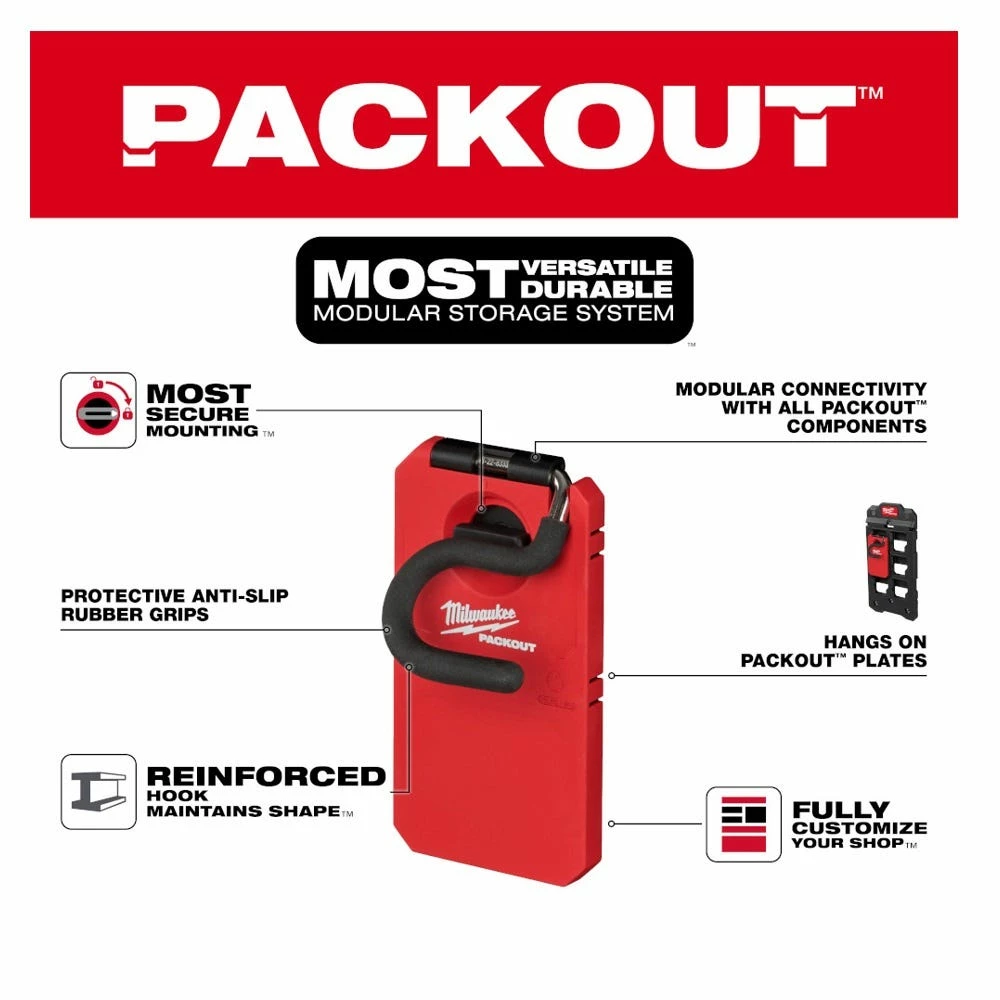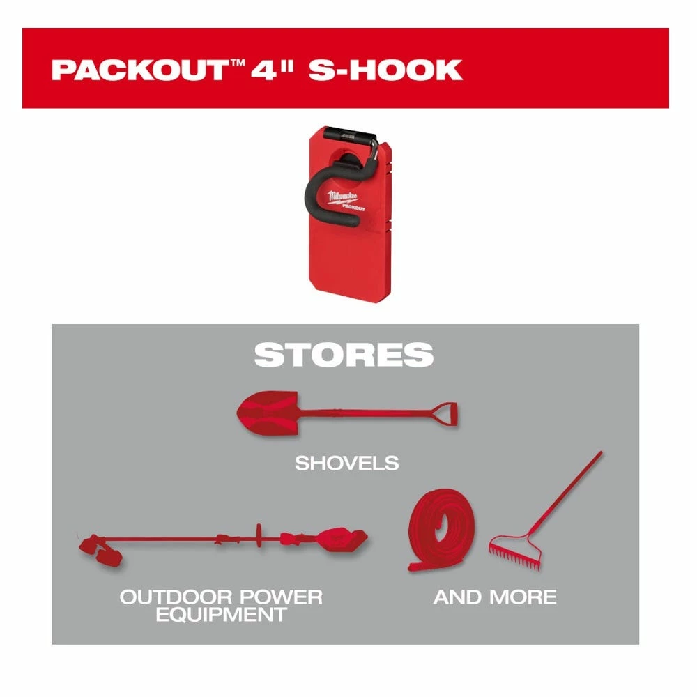 Our PACKOUT™ 4″ S-Hook delivers the most secure mounting when paired with PACKOUT™ Wall Plates, strongly holding the PACKOUT™ solution mounted to the wall. This hook is constructed with metal reinforcement to maintain shape when loaded and is optimized to store shovels, outdoor power equipment, and more. To keep your tools securely in place and protected, our hook features protective rubber grips. Additionally, our hook features connectivity with PACKOUT™ solutions allowing you to fully customize your shop, MILWAUKEE® PACKOUT™ is the industry’s most versatile and durable modular storage system.
