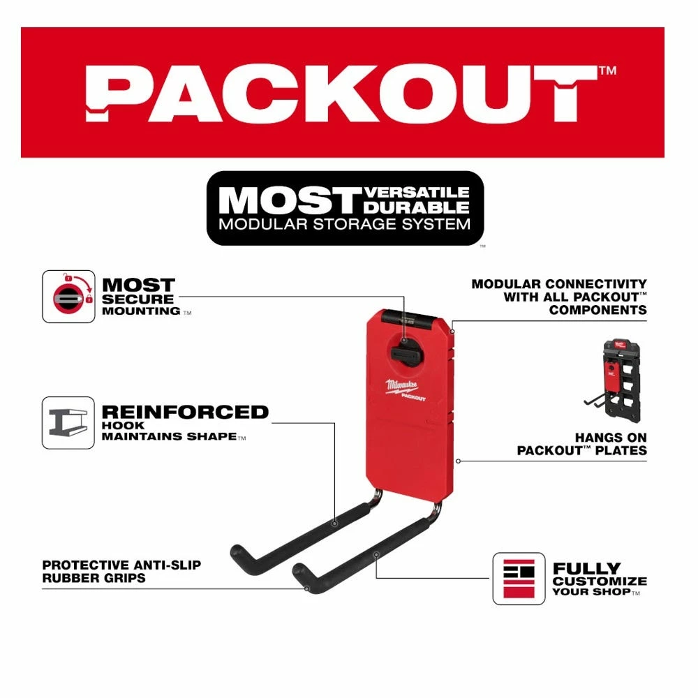 Our PACKOUT™ 9” Straight Hook delivers the most secure mounting when paired with PACKOUT™ Wall Plates, strongly holding the PACKOUT™ solution mounted to the wall. This hook is constructed with metal reinforcement to maintain shape when loaded and is optimized to store outdoor power equipment, multiple long-handled tools, and more. To keep your tools securely in place and protected, this hook features protective rubber grips. Additionally, our hook features connectivity with PACKOUT™ solutions allowing you to fully customize your shop, MILWAUKEE® PACKOUT™ is the industry’s most versatile and durable modular storage system.