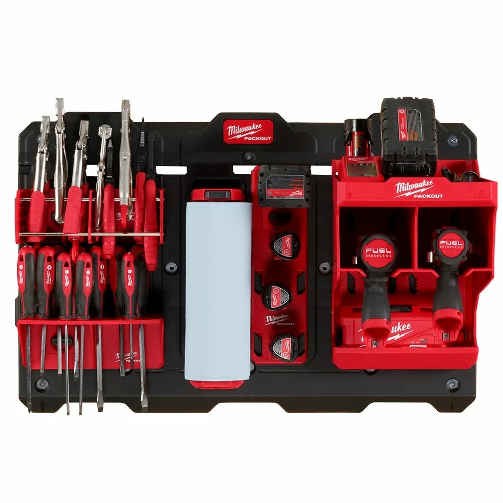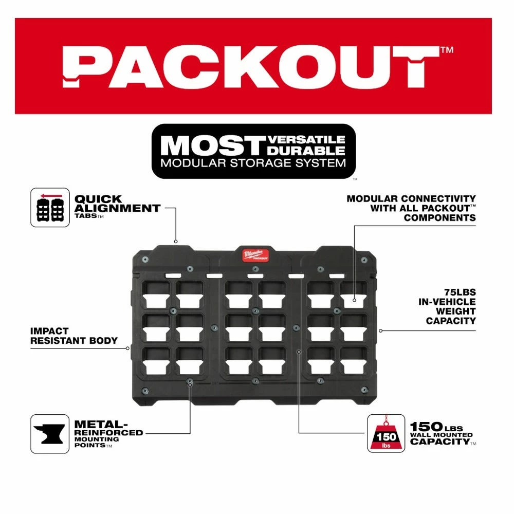 Our PACKOUT Large Wall Plate features Quick-Alignment Tabs to make installing rows and columns of multiple wall plates easier. This Large Wall Plate is constructed with metal reinforced mounting points and impact-resistant polymers that ensure secure mounting in shop, transit, and site environments. The wall plate has a 150 lb. weight capacity when mounted in the shop, and a 75 lb. capacity when mounted in vehicles. As part of the PACKOUT Modular Storage System, the PACKOUT Large Wall Plate allows you to customize your storage system and keep your storage solutions organized. MILWAUKEE PACKOUT is the industry’s most versatile and durable modular storage system.