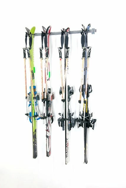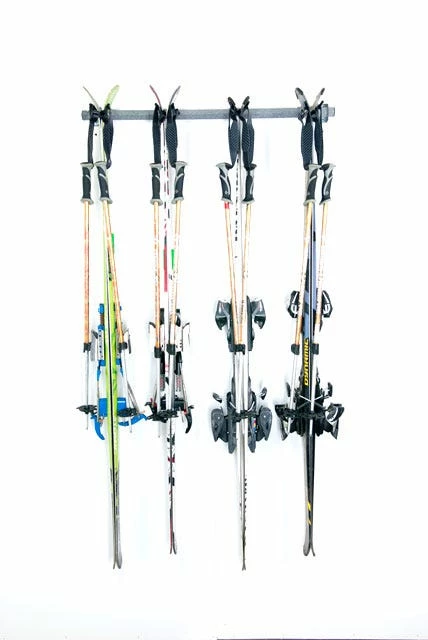 The Ski Storage Rack 4 by Monkey Bars is a terrific ski rack for families. This wall mounted ski rack holds 4 pairs of skis and poles securely and makes organizing skis simple and efficient. The ski rack mounts to wall studs in just 15 minutes and can be installed in a garage, shed, shop, closet, basement, or retail shop. The ski rack is made of powder coated industrial steel and accommodates skis of all sizes. The hooks snap tightly to the Monkey Bar and slide along the Monkey Bar, making it the most versatile ski rack on the market. The hooks have a polyurethane cover to protect skis while on the ski rack. Purchase your ski rack today, and see for yourself how easy it is to organize your skis.