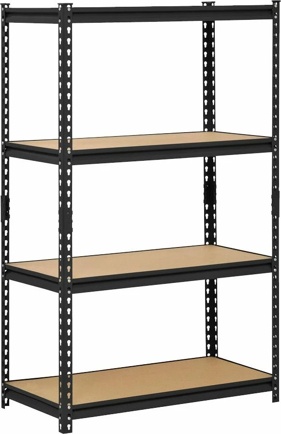 This storage rack has a frame made of steel for strength with a smooth black finish for resistance to corrosion, four adjustable particle board shelves, and a 2,000 lb. capacity when the weight is evenly distributed across all shelves. It is suitable for organizing and storing items. The shelves are supported by double-riveted beams and braces for strength, and adjust in 1 1/2″” increments to accommodate items of varying heights. The posts on this shelving unit have a two-piece design so it can be assembled vertically to create one 60″ x 36″ x 18″ (H x W x D) unit, or assembled horizontally to create two 30″ x 36″ x 18″ (H x W x D) units with two shelves each. (H is height, the vertical distance from lowest to highest point; W is width, the horizontal distance from left to right; D is depth, the horizontal distance from front to back.) This shelving unit’s rivet lock design requires no nuts or bolts for assembly. Assembly instructions are included, tools for assembly are not included.