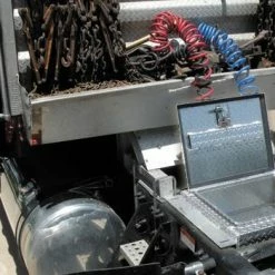 This heavy-duty Northern Tool + Equipment in-frame truck box is designed for mounting between the frame and truck rails to provide low-profile access for storage of heavy chains, binders and tie-down straps. Features rugged 0.100 diamond plate aluminum construction. U.S.A. Application: To provide low-profile access for storage of heavy chains, binders and tie-down straps, Dimensions L x W x H (in.): 24 x 24 x 8, Handle Type: T-Handle, Finish Type: Smooth body aluminum finish with diamond plate open lid, Mount Type: Between frame and truck rails.