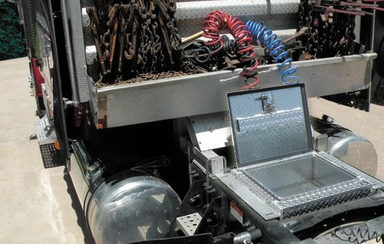 This heavy-duty Northern Tool + Equipment in-frame truck box is designed for mounting between the frame and truck rails to provide low-profile access for storage of heavy chains, binders and tie-down straps. Features rugged 0.100 diamond plate aluminum construction. U.S.A. Application: To provide low-profile access for storage of heavy chains, binders and tie-down straps, Dimensions L x W x H (in.): 24 x 36 x 10, Handle Type: Pad Lock, Finish Type: Smooth body aluminum finish with diamond plate open lid, Mount Type: Between frame and truck rails.